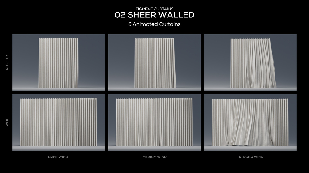 FIGMENT CURTAINS - 02 SHEER WALLED is a collection of 6 animated curtains for use in 3D Arch-Viz and VFX.