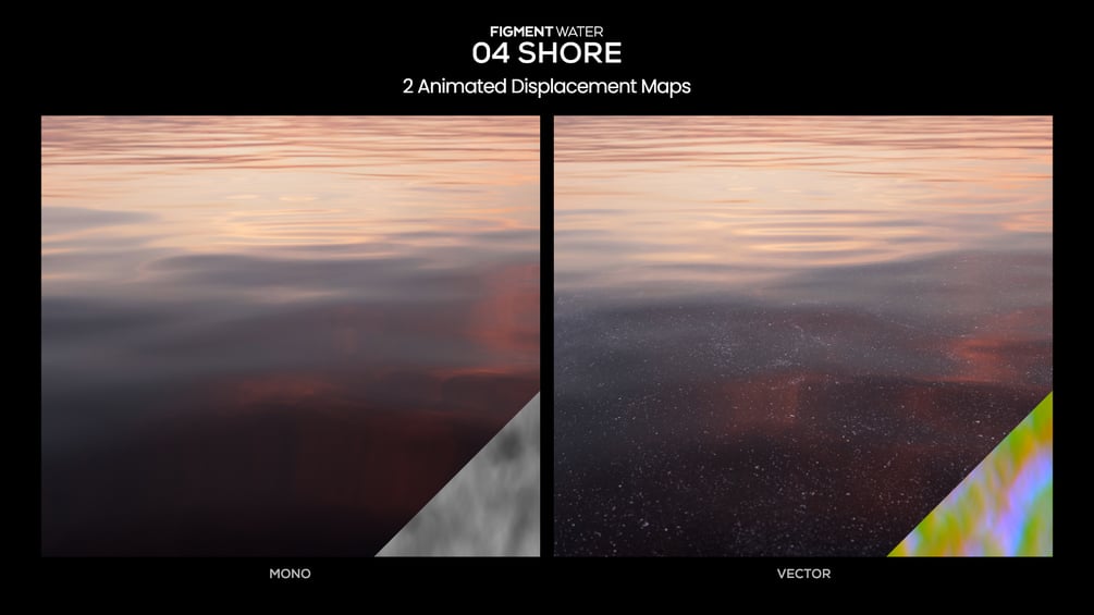 FIGMENT WATER - 04 SHORE is two animated displacement maps, designed for small-scale water in 3D animation and VFX.