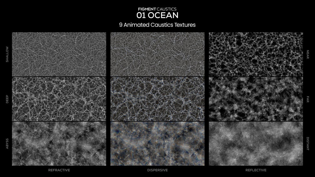 FIGMENT CAUSTICS VOLUME 1 is an animated caustics texture collection featuring five unique types—each available individually but offered here with a 30% bundle discount.